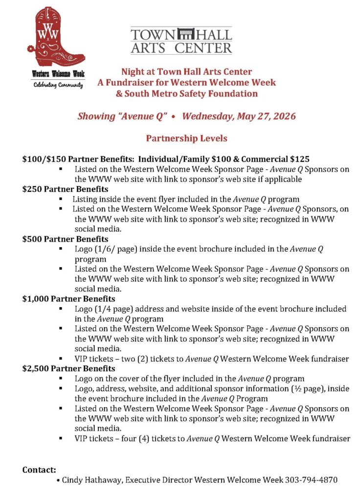 Join us for a FUN fundraising event – Avenue Q at Town Hall Arts Center – May 27, 2026.Join us for an evening packed with FUN — including photo opportunities with South Metro Safety Foundation’s Engine 1/2 and Western Welcome Week cutouts. Ticket includes: before show appetizers, drinks – each ticket includes two drink tickets, a fantastic show, intermission desserts, and a silent auction — all in support of two great causes!